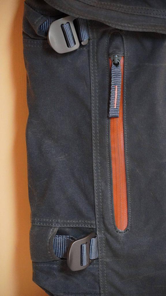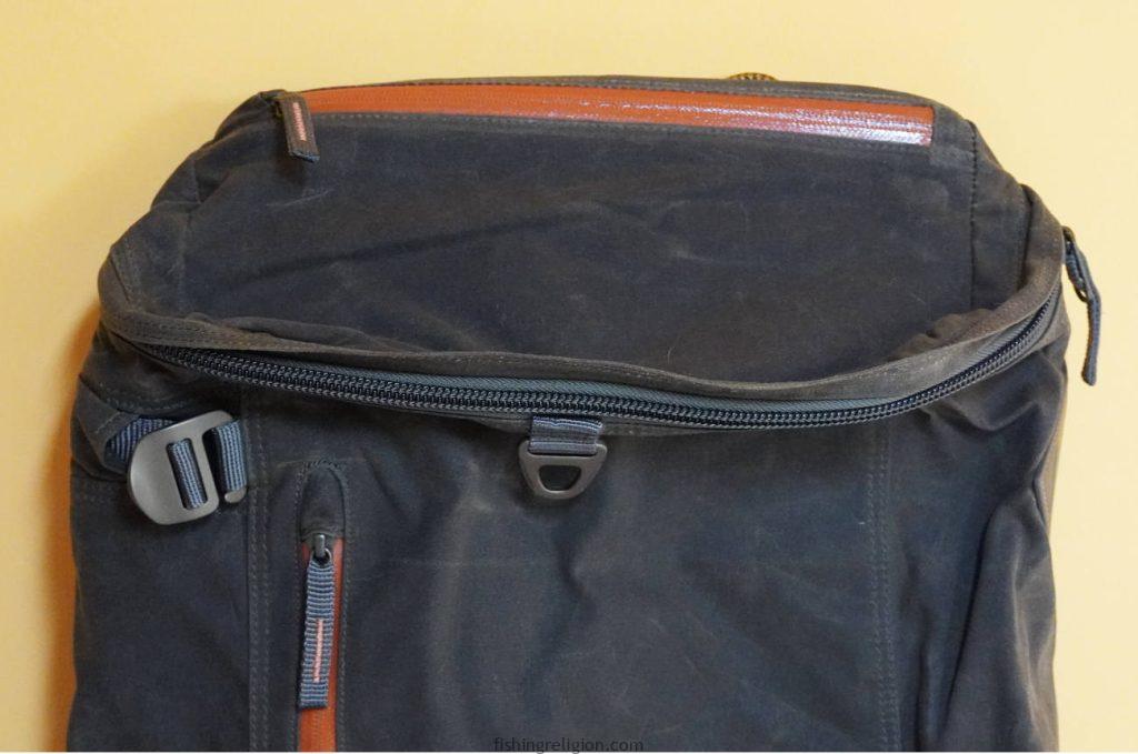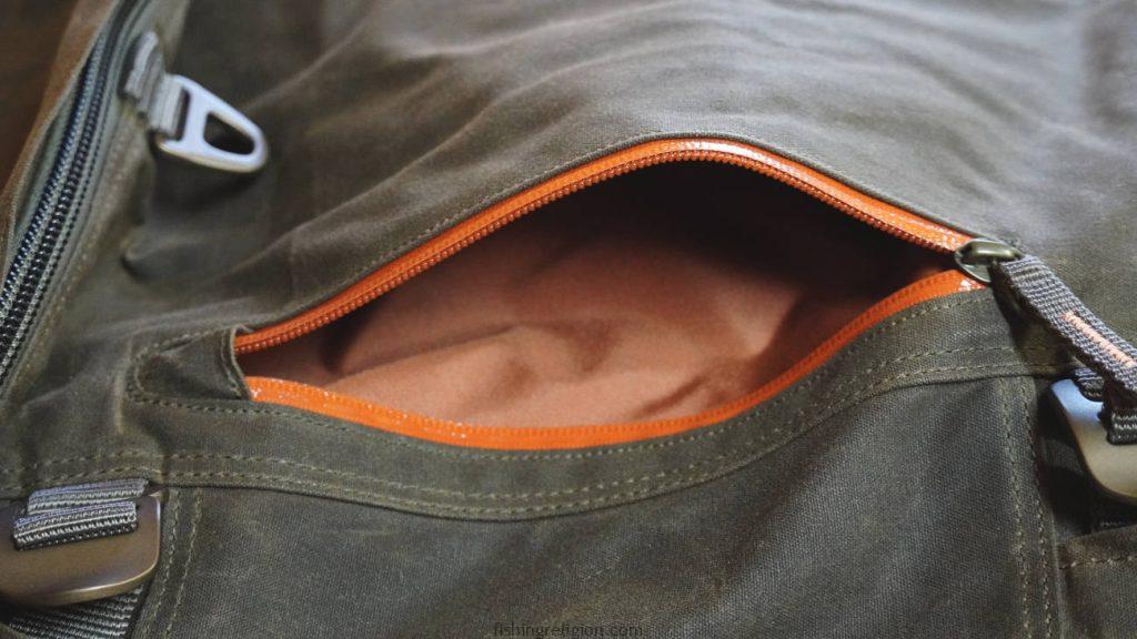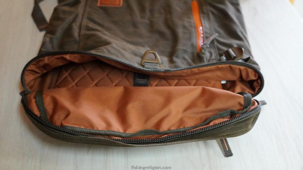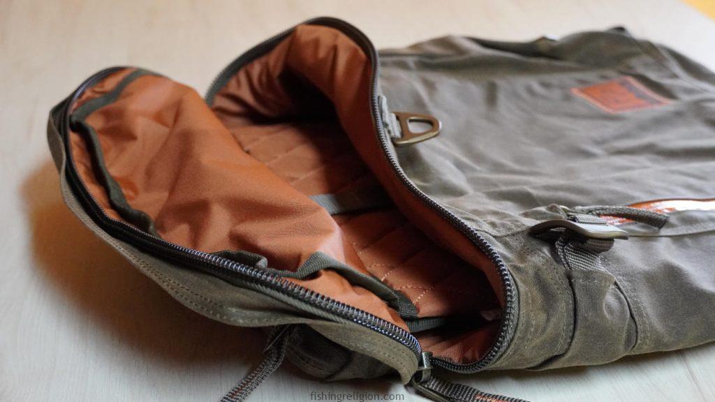 Unlike many modern fishing backpacks made entirely from synthetic fabrics, this model uses 10.10 oz certified organic waxed cotton on the outside.